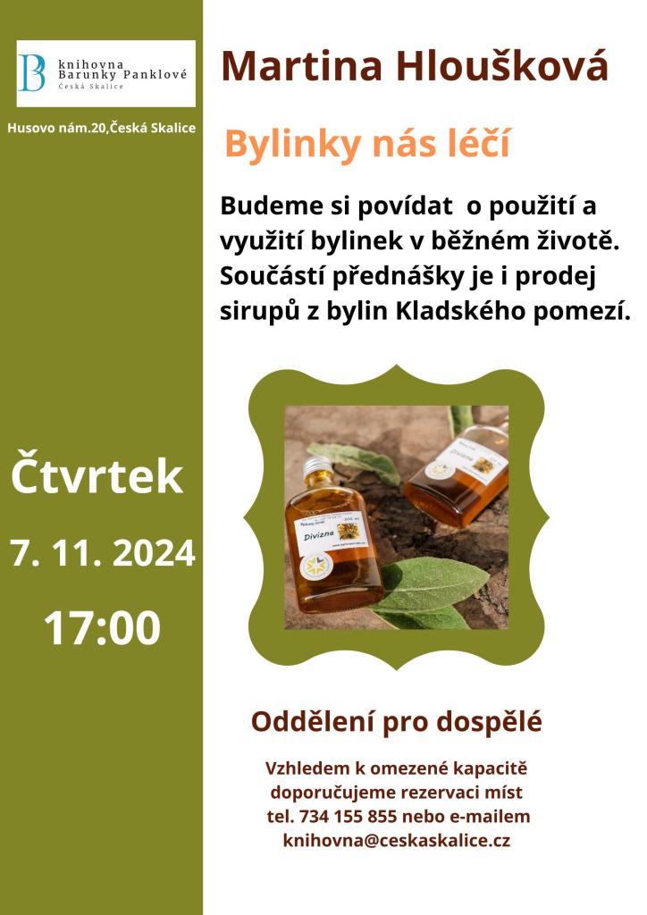 Čtvrtek 17. hodin Oddělení pro dospělé Beseda o bylinkách s Martinou Hlouškovou