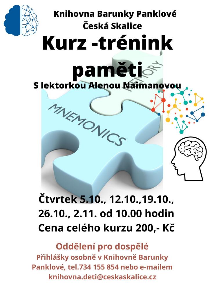 Trénování paměti a dalších mozkových funkcí je u seniorů velmi důležité. Pozvánka na kurz vedený lektorkou paní Naimanovou. Cena za celý kurz 200,- Kč.