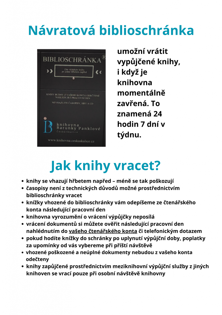 Umožní vrátit vypůjčené knihy, i když je knihovna momentální zavřená. To znamená 24 hodin a 7 dní v týdnu. Biblioschránka stojí před budovou Knihovny Barunky Panklové čp. 20 na Husově náměstí.