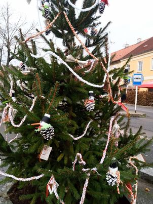 Ozdoby na náš stromeček vyráběly děti s Lídou, Martinou a Radkou na Tvoření a jsou velmi pěkné. Posuďte sami. Stojí jako první v řadě před Knihovnou Barunky Panklové.