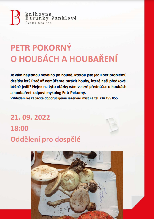 Z důvodu onemocnění přednášejícího rušíme přednášku O houbách a houbaření 21.9.2022.