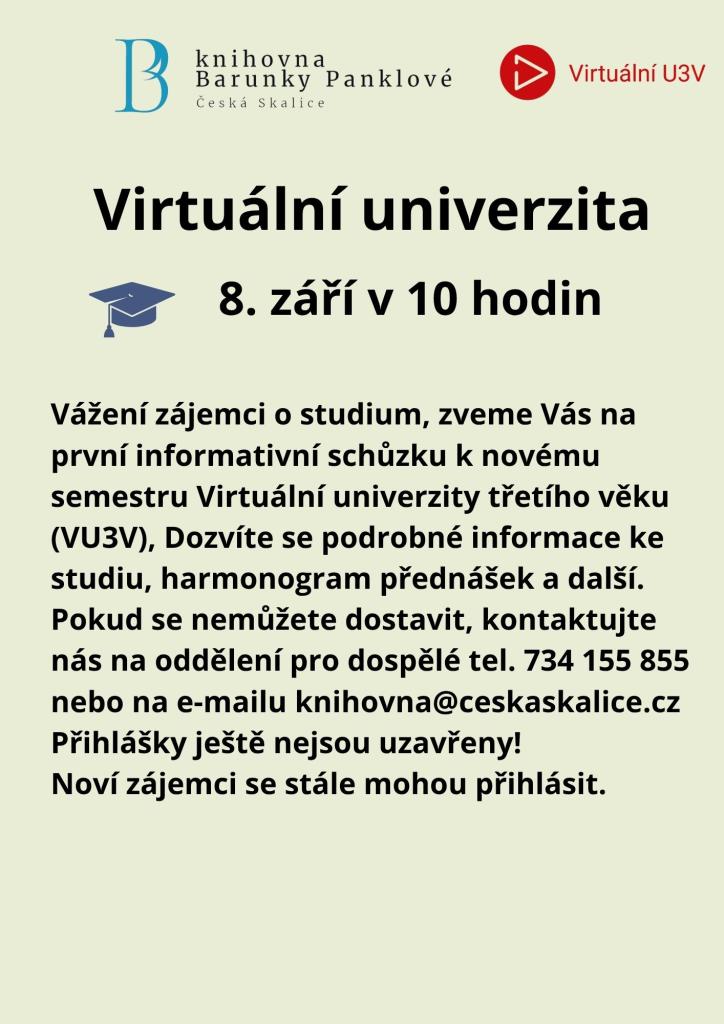 Zveme vás na schůzku, která je určena zájemcům o Univerzitu třetího věku. Na této schůzce se dozvíte o různých vzdělávacích programech a aktivitách, které nabízíme. Je to skvělá příležitost potkat se s ostatními zájemci a získat cenné informace o možnostech, jak se zapojit do našeho vzdělávacího programu.
